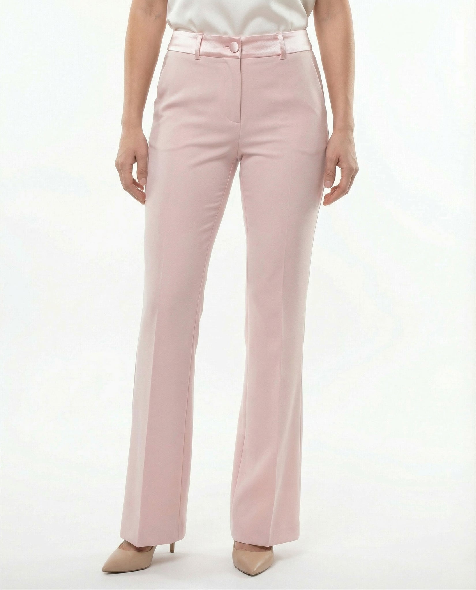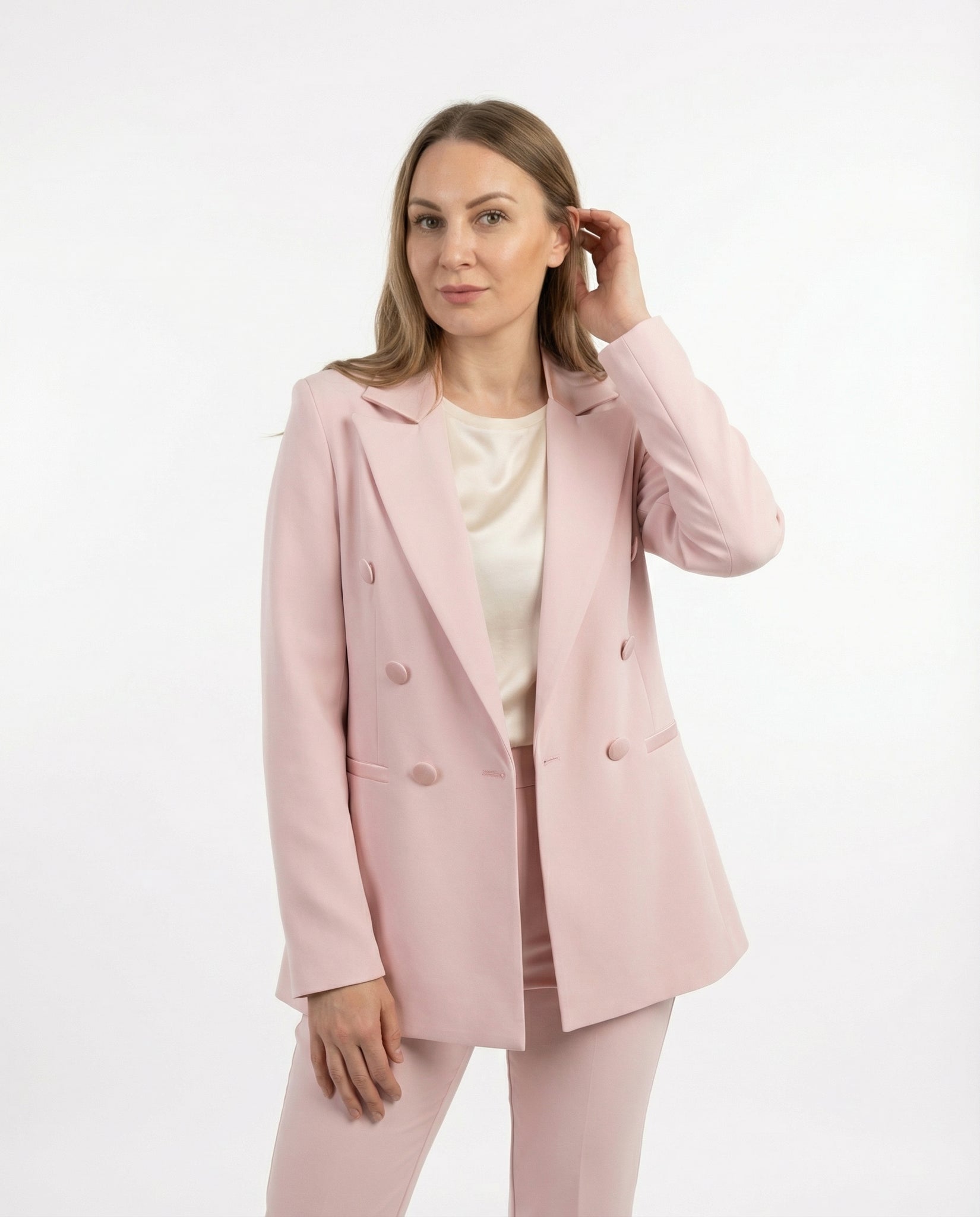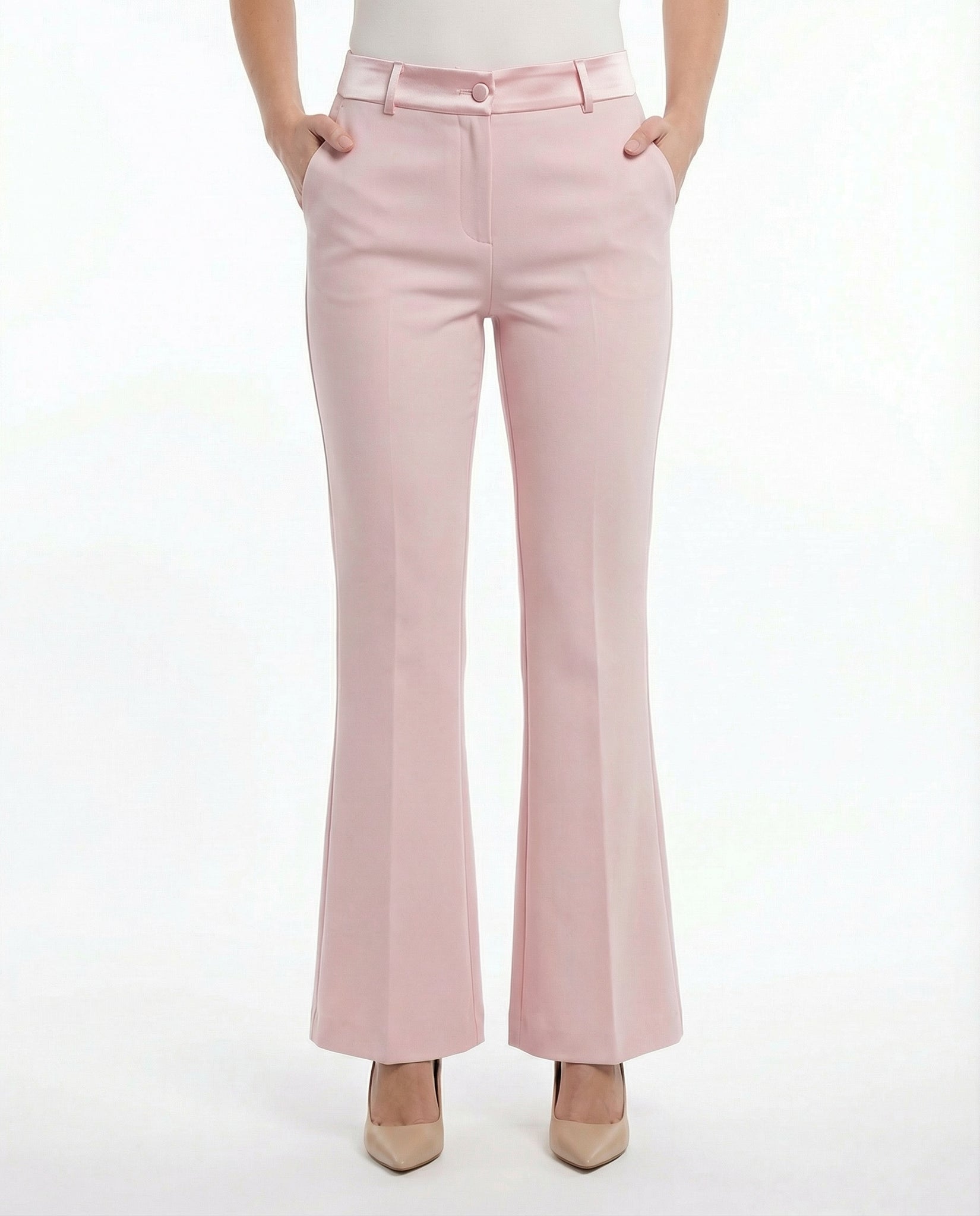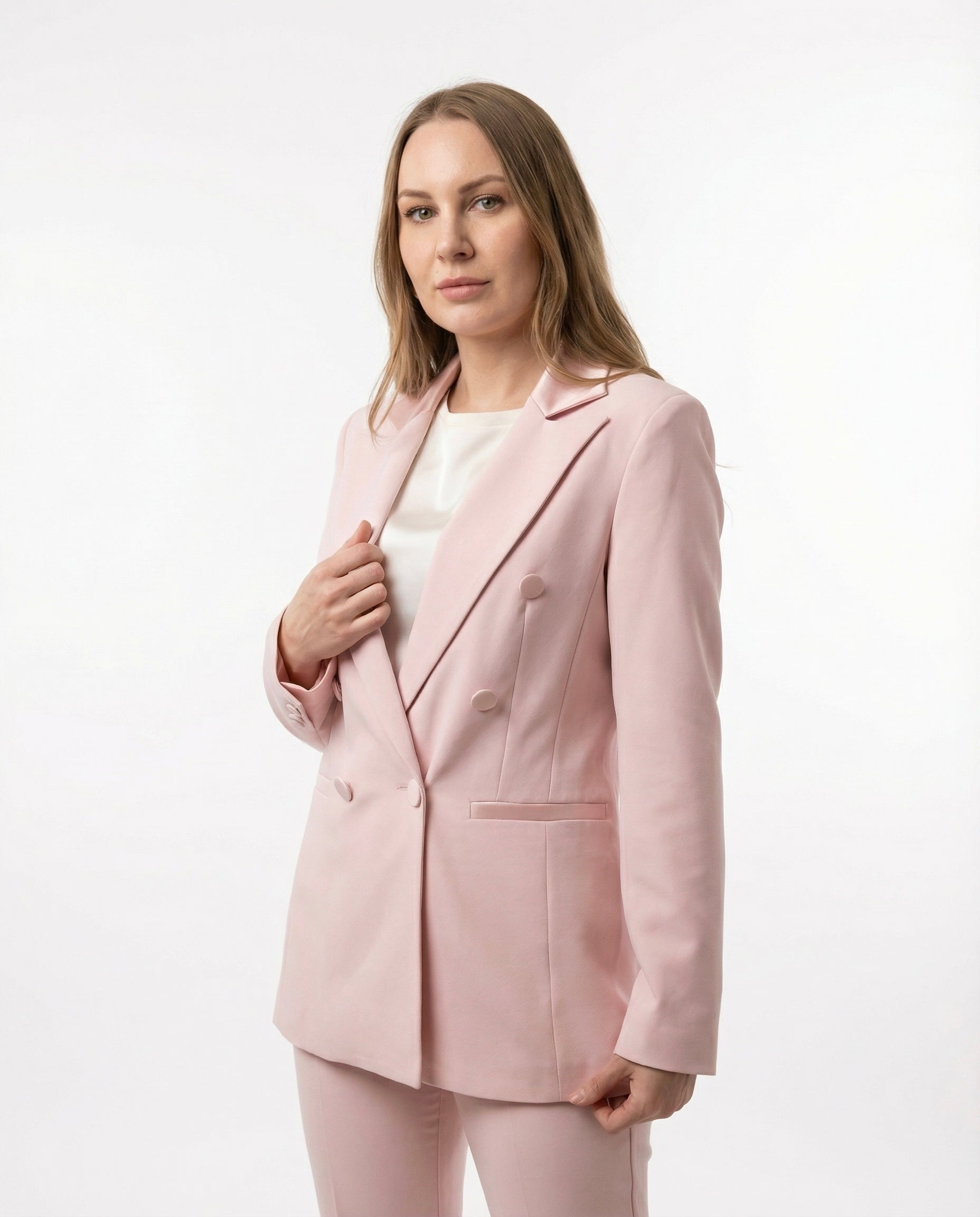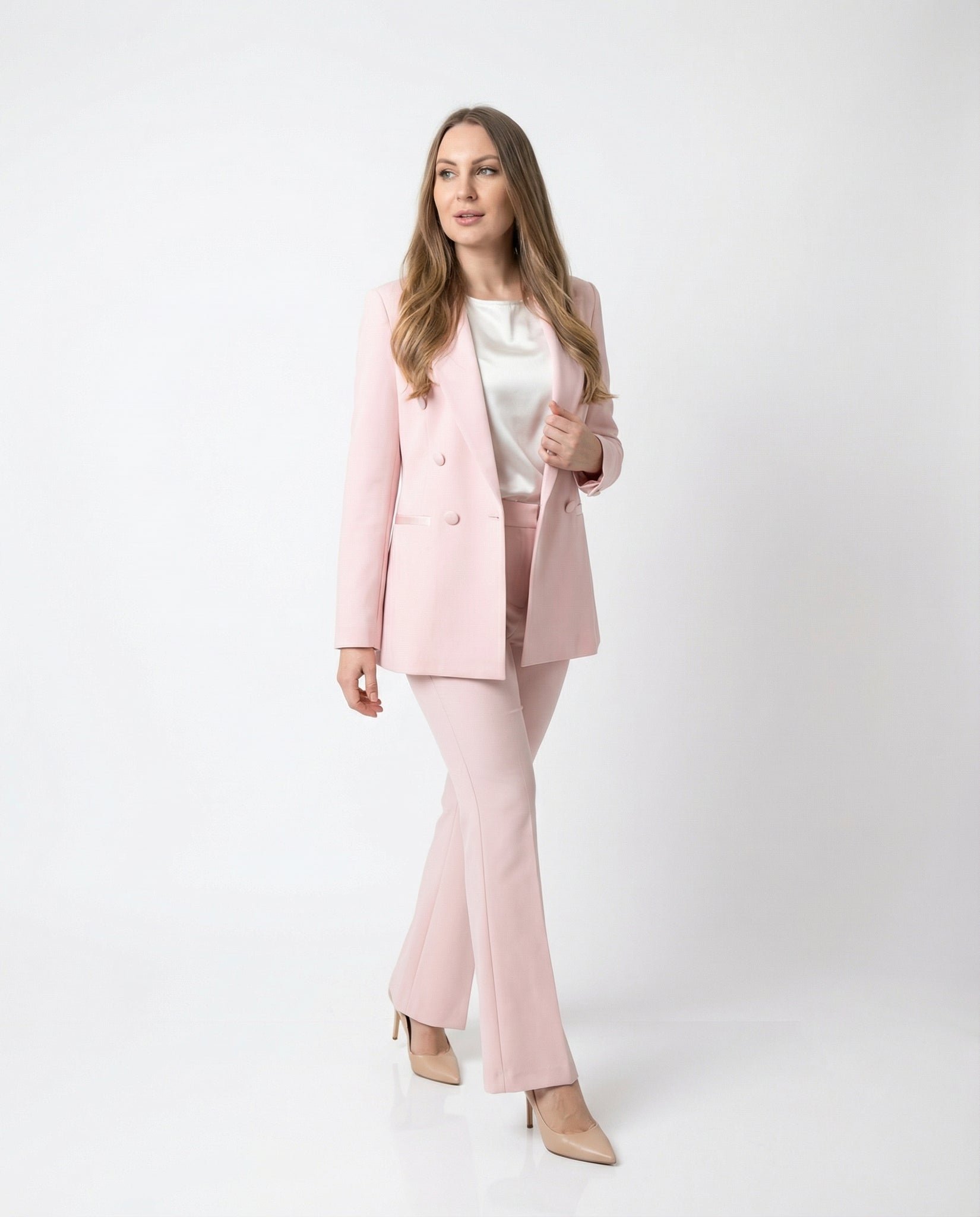 Completo Giacca Doppiopetto e Pantaloni a Zampa Rosa Cipria con inserti in Raso