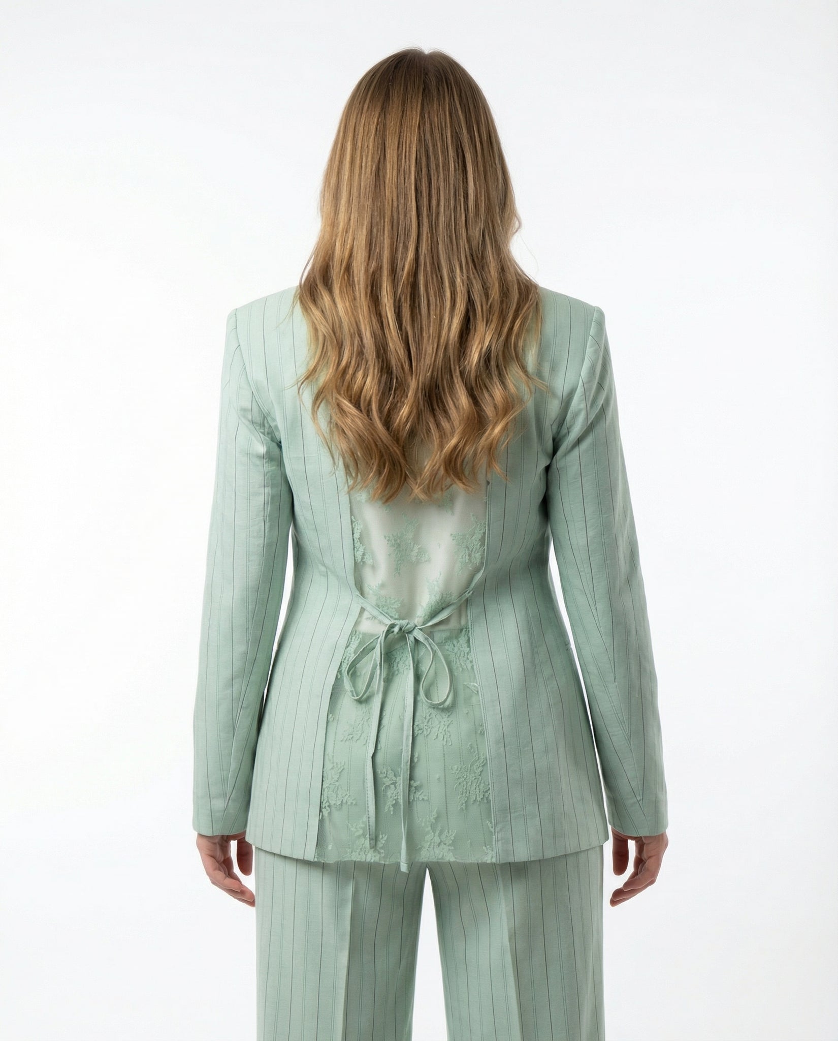 - Giacca blazer monopetto con bottoni chiari, dettagli tulle sul retro e fiocco regolabile