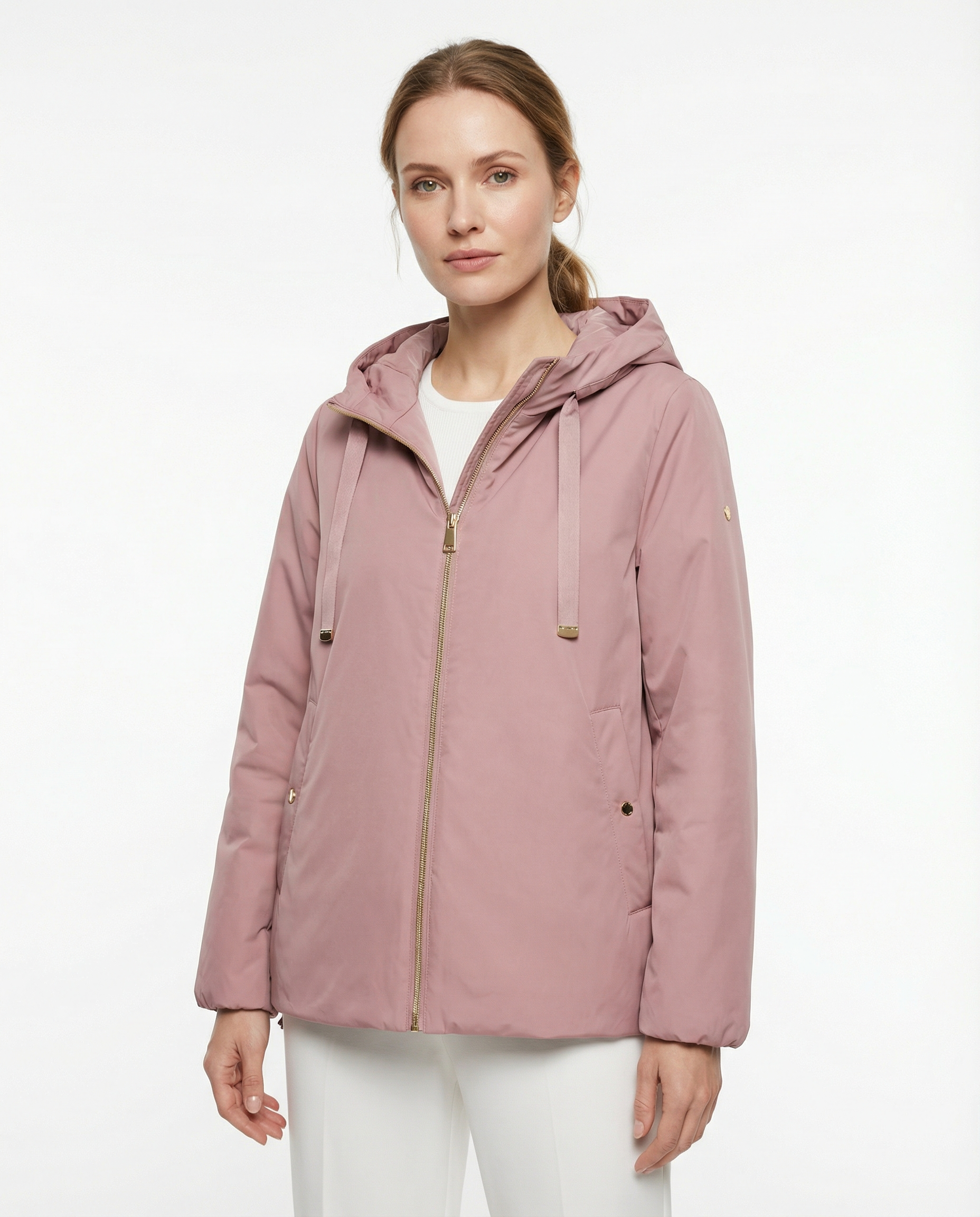 - Cappuccio con coulisse e terminali in metallo dorato