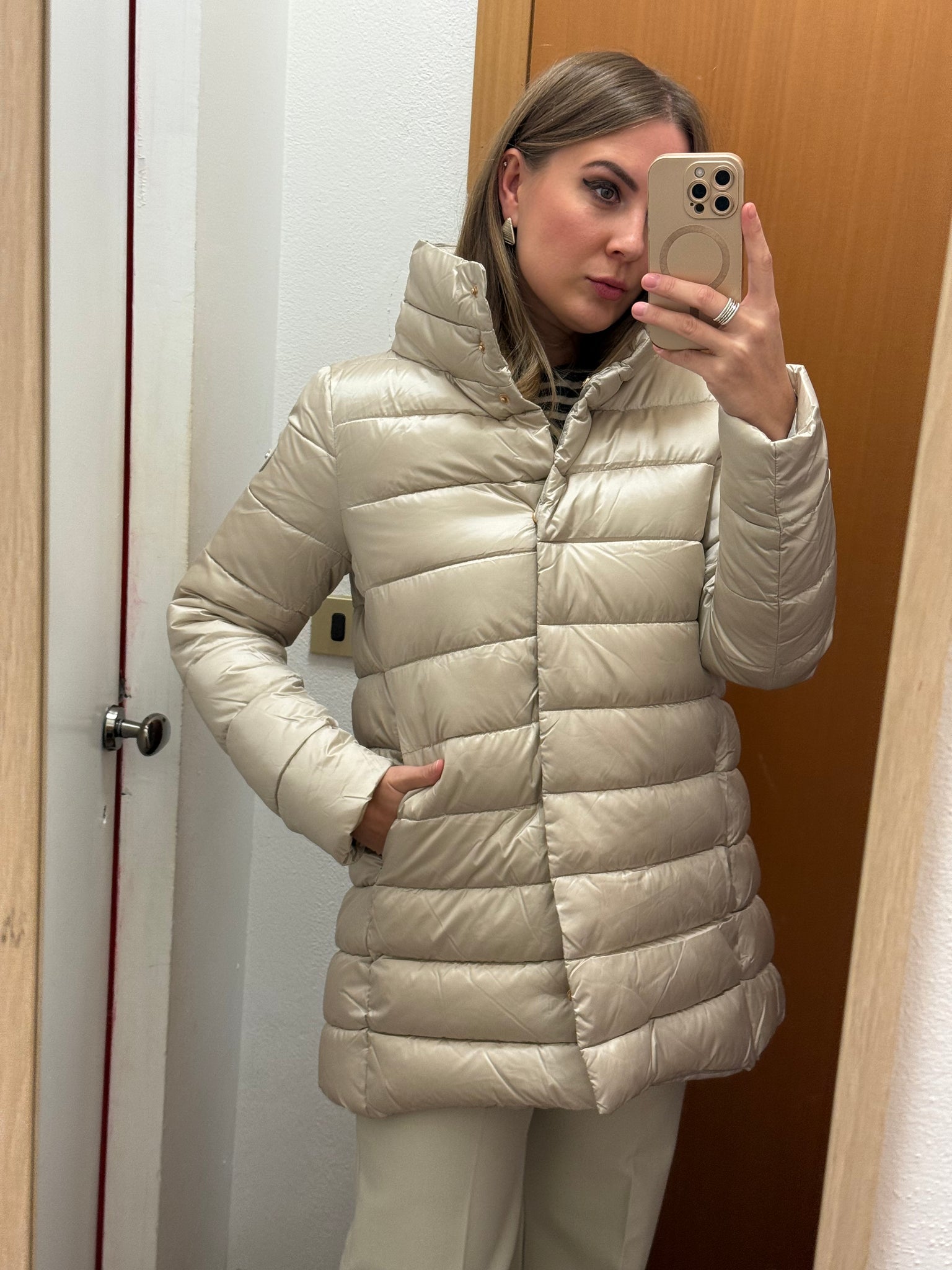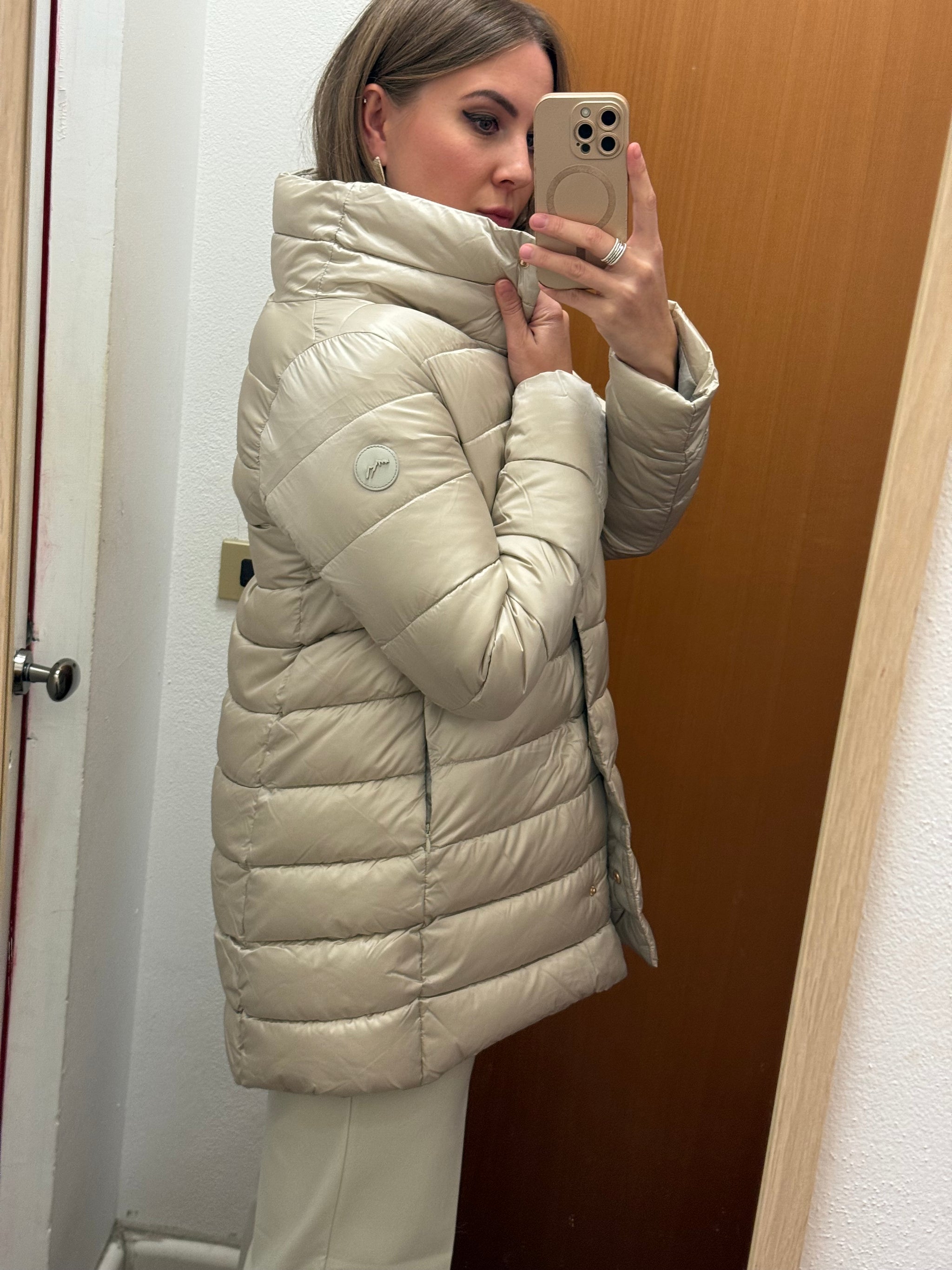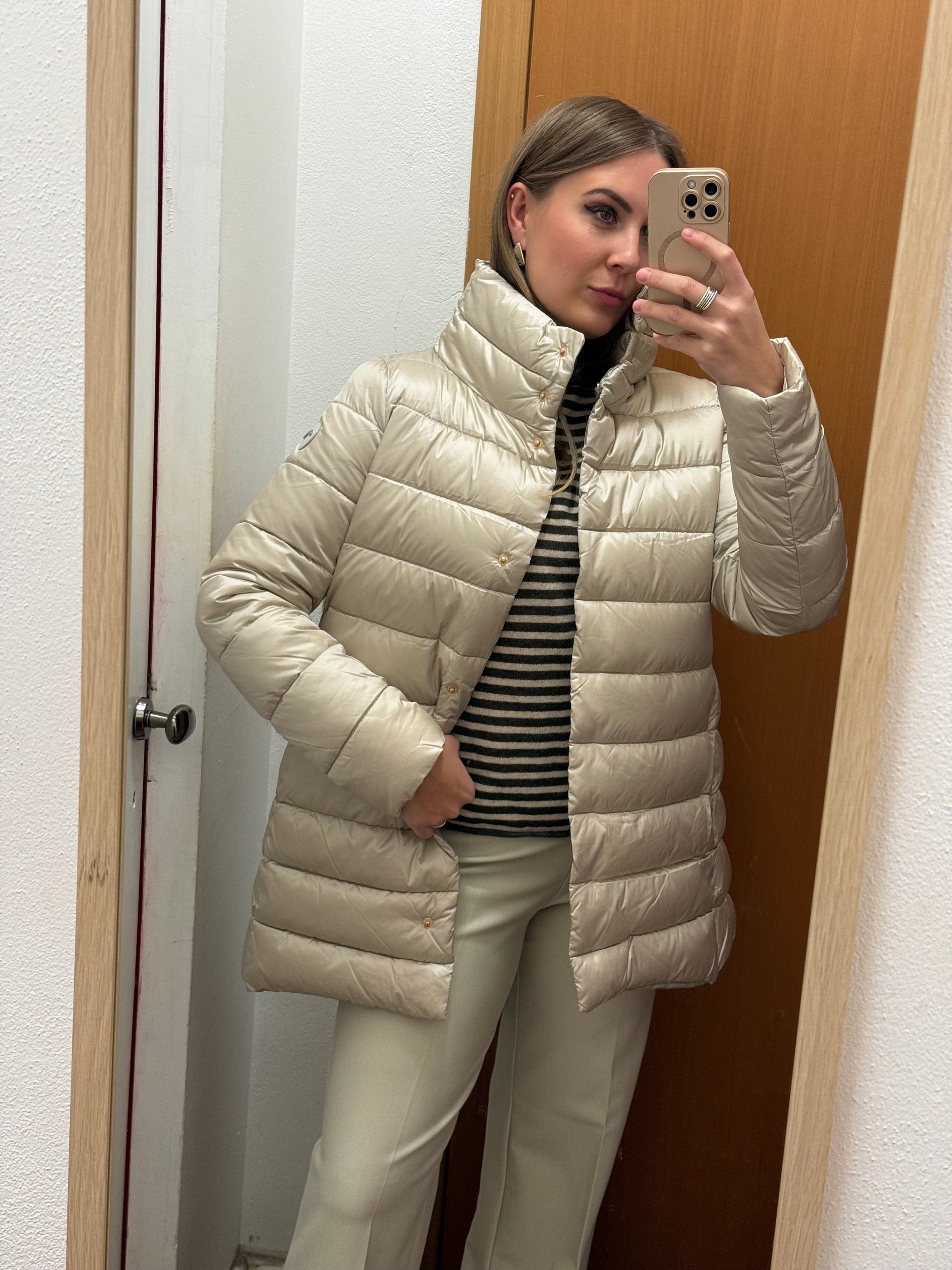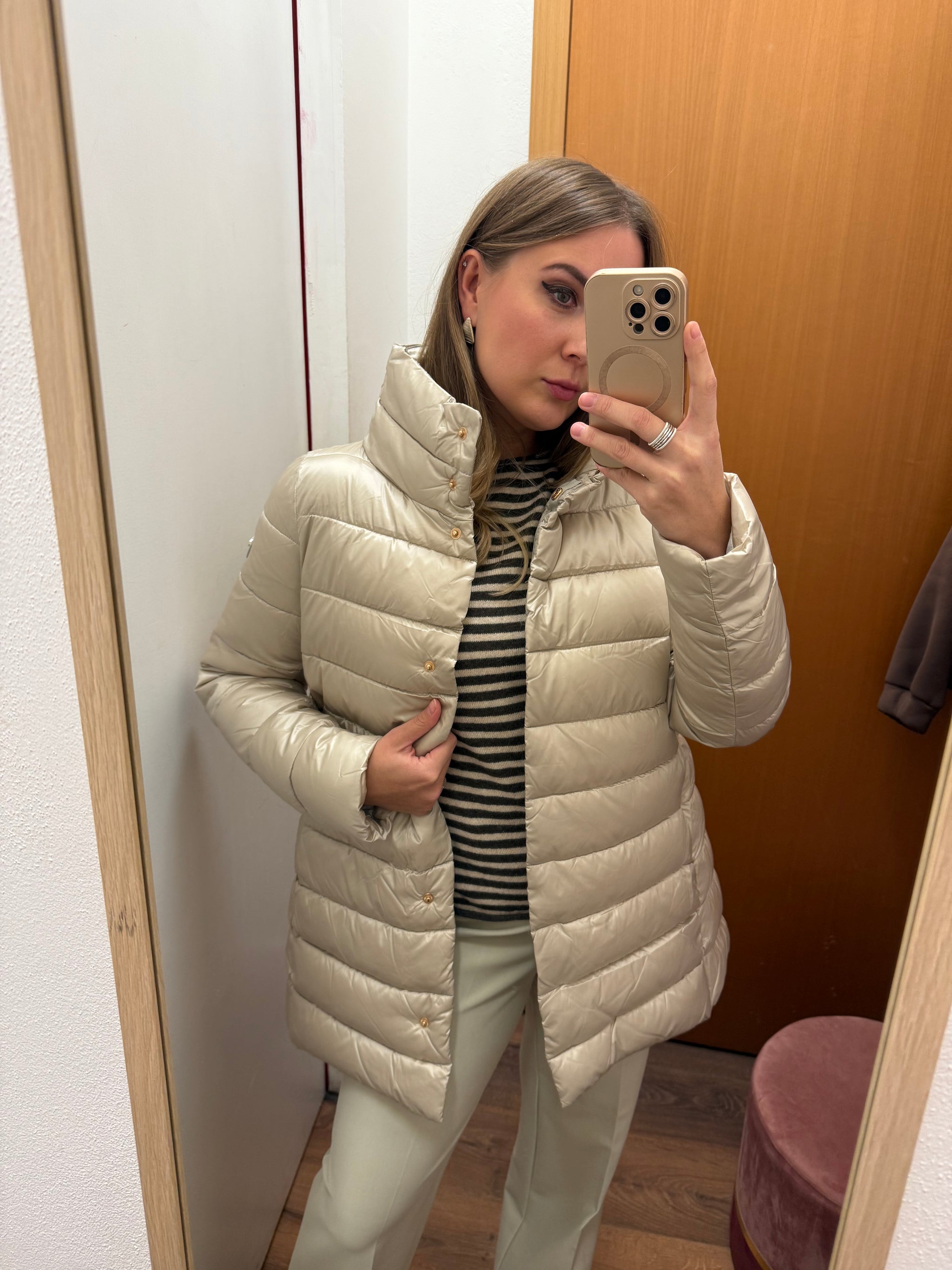 Piumino lunghezza media, color avorio con collo alto, senza cappuccio, chiusura con i bottoni a clip